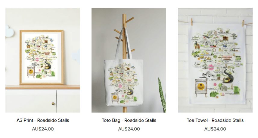 This hand-illustrated artwork isn’t just a map; it’s a keepsake. A love letter to the places we explore and the stalls we return to. You can grab it as a tea towel, tote bag or A3 print, all printed on beautiful stock and ready for your next Hills adventure. Perfect for gifting, displaying or keeping in the glovebox for those spontaneous roadside finds.