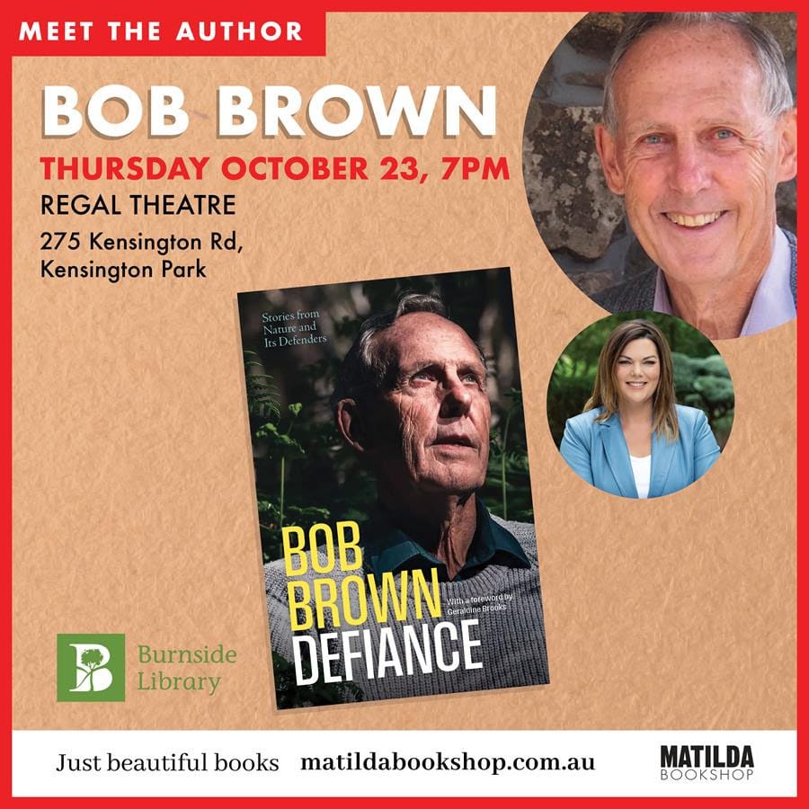 Matilda’s Bookshop Present: Meet the Author: Bob Brown for the launch of his new book, Defiance: Stories from Nature and It’s Defenders. Bob Brown, environmental and social justice campaigner and former senator, will be in conversation with Greens Senator, Sarah Hanson-Young, talking about stories of courage and conviction from the environmental frontline. Matilda’s will be presenting Bob and Sarah, in partnership with the Burnside Library at 7pm on Thursday October 23rd at The Regal Theatre, 275 Kensington Road, Kensington Park. Book Your Ticket Here.
